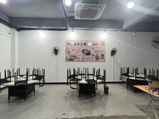 ◦ 前厅:餐桌椅+嵌入式火锅桌+空调5台+壁扇12台+监控系统+收银系统